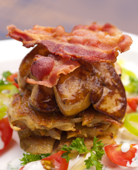 Libamáj burgonyalángoson, pirított baconnal, fokhagymás tejföllel